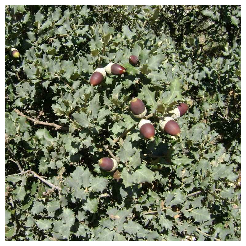Le Chêne à feuilles rondes est très proche de notre Chêne vert (Quercus ilex) mais se distingue par sa plus petites taille, par ses feuilles dentées surtout dans son jeune âge et surtout par ses glands à faible teneur en tanins (nourriture des pauvres et du bétail).