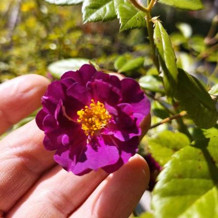 Quelle merveille que Rosa 'Violetta'! Ses petites fleurs semi-double, d'un superbe pourpre réhaussé par des étamines jaunes attirent immanquablement le regard, même de loin. Elles sont regroupées en grappes lâches sur lesquelles elles se succèdent.